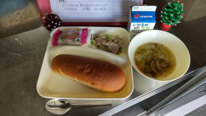 今日の献立は ・豚肉と野菜のソテー ・スープ ・スイートポテト ・パン ・牛乳 です