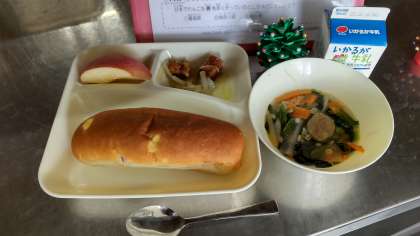 今日の献立は ・さけのマリネ ・肉だんごと押麦のスープ ・りんご ・パン ・牛乳 です