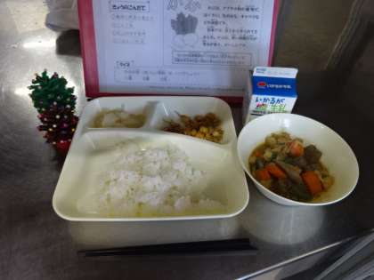 今日の献立は ・鶏肉と野菜の煮もの ・じゃこ豆 ・かぶのゆず風味 ・ごはん ・牛乳 です