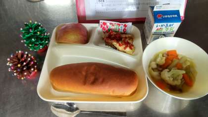 12/ 19 今日の給食 公開日 2024/12/19 更新日 2024/12/19 お知らせ 今日の献立は ・とうふローフ ・ケチャップ(袋) ・カリフラワーのスープ煮 ・りんご ・パン ・牛乳 です いいね(0)
