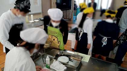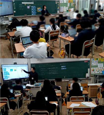 写真上は5年プログラミング教育(算数)、写真下は6年家庭科「こんだてを工夫して」(調理実習)です。