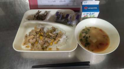 今日の献立は ・れんこんのちらしずし ・きざみのり ・ぞう煮 ・ごまめ ・牛乳 です