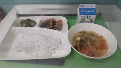 今日の献立は ・さばのカレーたつたあげ ・五目汁 ・きゅうりの甘酢あえ ・ごはん ・牛乳 です