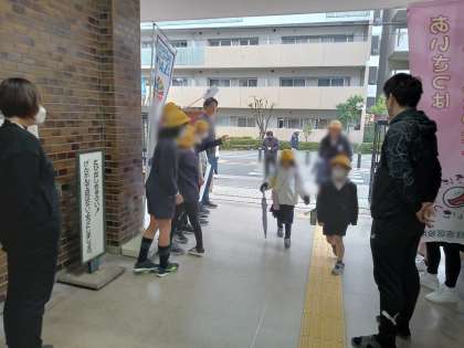 5,6年のメディア委員会の子どもたちが月曜日から玄関前に立って元気にあいさつをしています。