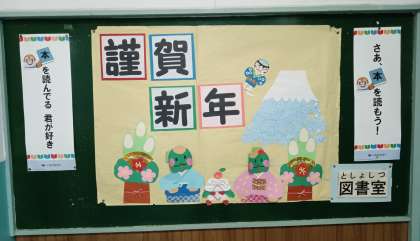 図書室前の掲示板は、2025年の始まりにふさわしい掲示物が飾られています。