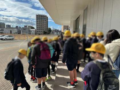 5年生は、目的地である朝日新聞大阪工場に到着しました。