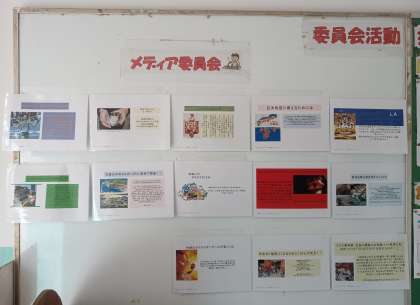 1階の1号階段前には、委員会活動の掲示板があります。そこに、メディア委員会の掲示物が飾られていました。