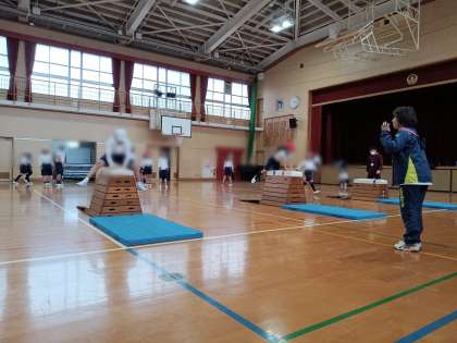 5年生は、体育館で跳び箱運動で、主に開脚跳びの練習です。跳び箱が得意な子はより美しく、苦手な子が一歩でも前に跳べるように懸命に練習していました。