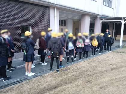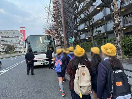定刻通り、7時20分に学校を出発しました。今からバスに乗って、目的地の「キッザニア甲子園」に向かいます。