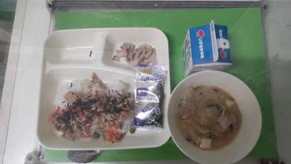 今日の献立は ・鶏ごぼうご飯 ・みそ汁 ・焼きれんこん ・きざみのり(袋) ・ 牛乳 です