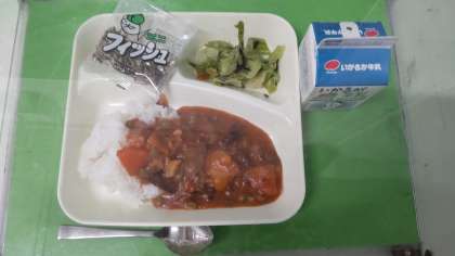 今日の献立は ・ハヤシライス ・キャベツのひじきドレッシング ・ミニフィッシュ ・牛乳 です