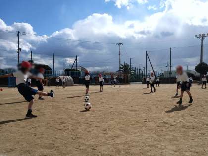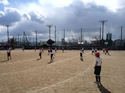 3年生は極寒(!?)の中、運動場で体育の学習です。写真は、3対1や4対1の状態でボールを回し、相手にボールを触らせないようにするゲーム(いわゆる“鳥かご”)をしているようすです。