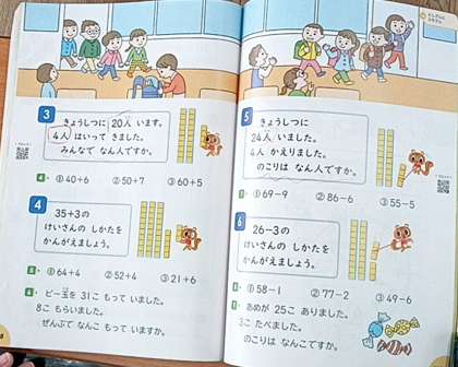 2/10 1年 算数科 公開日 2025/02/10 更新日 2025/02/10 お知らせ 1年生の算数は「たしざんと ひきざん」です。 24−4や26−3などのひき算の計算について学習しました。 子どもたちは、「何十といくつ」(24あれば二十と四)に目を向けて、位ごとに分けて計算する仕方理解しました。 入学当初は10までの数を学習していた子どもたちが、およそ10か月の間に100までの数の計算ができるようになりました。 子どもの成長の速さには驚くばかりです。 いいね(0)