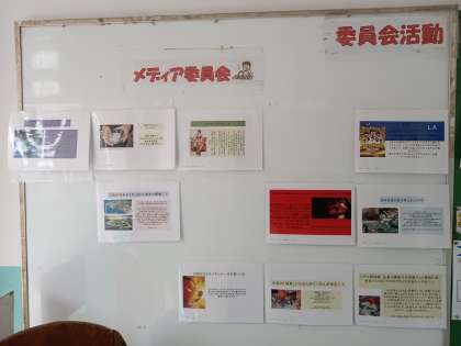 一号階段(職員室近く)の委員会用掲示板には、毎月恒例(⁉)のメディア委員会による最近気になるニュースが掲示されていました。