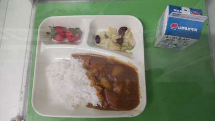 今日の献立は ・チキンカレーライス ・ビーンズサラダ ・いちご ・牛乳 です