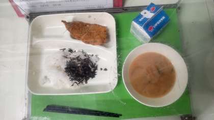 今日の献立は ・いわしフライ ・みそ汁 ・牛ひじきそぼろ ・ごはん ・牛乳 です
