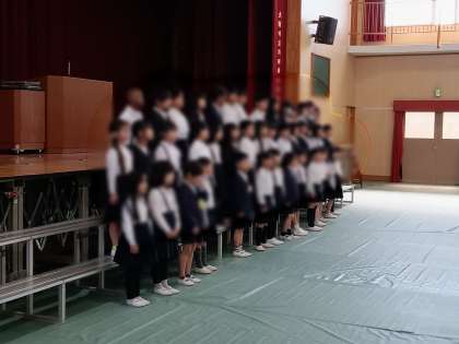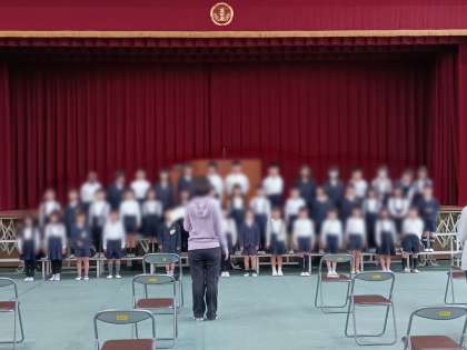 ひな壇にずらっと並んだ1年生の子どもたちの姿は、およそ1年前と比べるととてもしっかりしていて頼もしく感じます。この日の練習も、近くの職員室まで聞こえるほど大きな声で元気よく呼びかけをしていました。