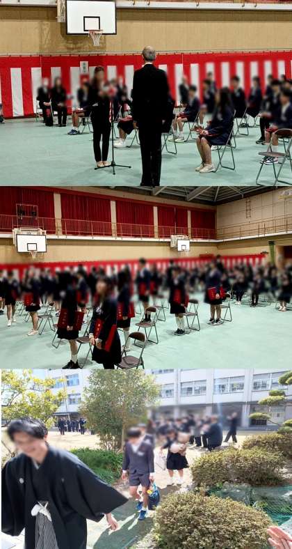 閉式、保護者代表の謝辞の後、卒業生が大きな拍手の中退場し、最後は中庭に花道を作ってみんなで卒業生を送り出しました。