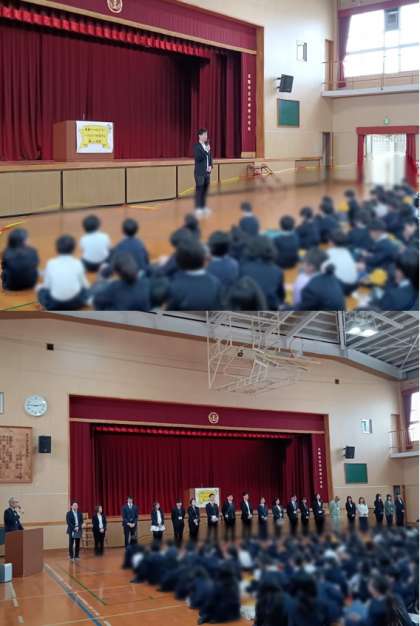 最初に、講堂で着任式を行いました。昨年度末で学校を去った教職員の方の紹介の後、4月から本校に来られた教職員の方が紹介され、舞台の上から一人ずつ挨拶をされました。
