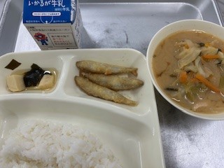 今日の献立は ・きびなごてんぷら ・みそ汁 ・わかたけ煮 ・ごはん ・牛乳 です。