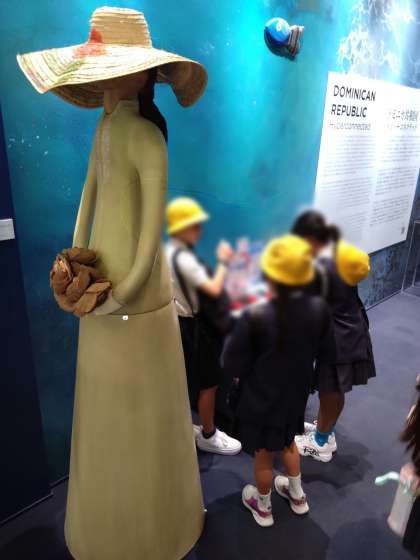 途中、複数の国のブースで構成されている「コモンズ館」を見学しています。下の写真は、コモンズB館にある「ドミニカ共和国」のブースです。子どもたちはスタンプが大好きですね(笑)。