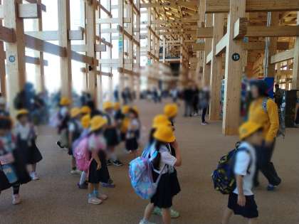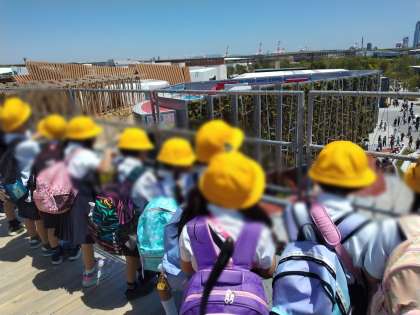 写真上は、大きなリングの下をみんなで歩いているようすです。写真下は、大屋根リングに上り、広い会場内の景色をみんなで眺めています。
