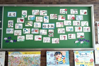 5月は6年生の「絵手紙」。目標や願い、感謝の気持ちなどを表した短い言葉に簡単な絵を添えた絵手紙は、特に毛筆での手描きが読み手に温かい印象を与えています。