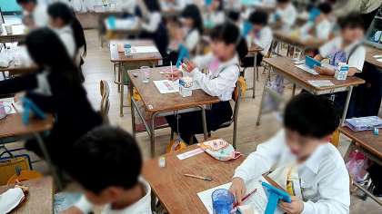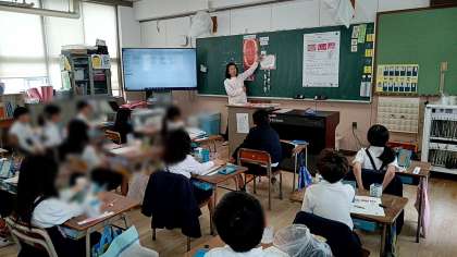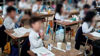 子どもたちは、虫歯や歯垢(しこう)についての説明の後、実際に歯垢の付き具合を染色液で確認しました。そして、歯みがきの仕方を映像で確認した後に歯ブラシを使って歯のみがき方を実践しました。