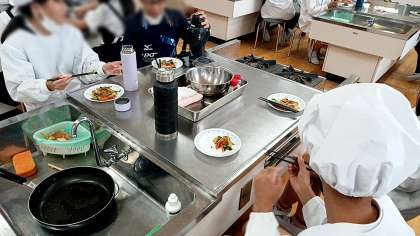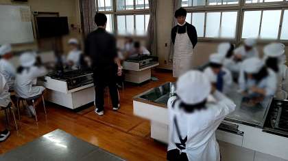 5/9 6年 家庭科 公開日 2025/05/09 更新日 2025/05/09 お知らせ 6年は、午後から家庭科で調理実習を行いました。 テーマは「いためてみよう」ということで、ニラとにんじん、玉ねぎを使った「三色野菜いため」を作りました。 写真は実食のようすです。給食の後だったので量はそれほどでしたが、子どもたちは自分たちの手で作った野菜炒めを美味しく味わっていました。 いいね(0)