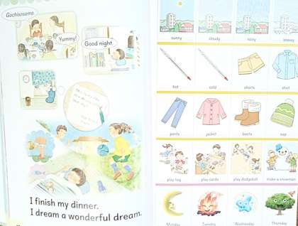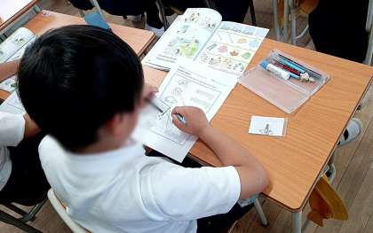 写真は、天気の様子のワークシートを使って学習しているようすです。絵と同じ意味の英語を線で結び、シートが出来上がった子は、先生のところへ行ってリスニングとスピーキングで答えを確かめていました。