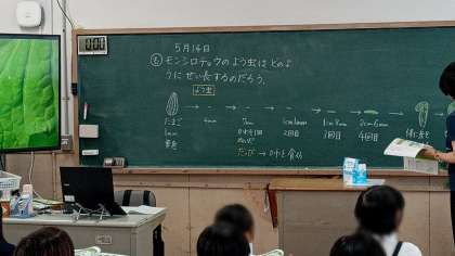 5/14 3年 理科 公開日 2025/05/14 更新日 2025/05/14 お知らせ 3年生の理科は「チョウを育てよう」です。チョウの育ちや成虫の体のつくりについて学習していました。 チョウが卵→幼虫(イモムシ)→さなぎ→成虫(チョウ)と大きく形を変えながら成長することを動画で視聴し、ノートにまとめていました。 学校でもアゲハチョウを幼虫をよく見かけるので、葉の裏や茎の近くなどをよく探してみると見つけることができるかもしれませんね。 いいね(0)