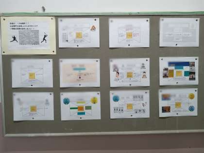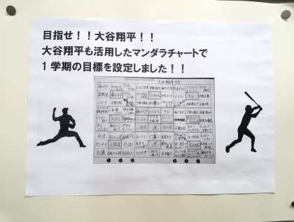 4号階段踊り場にある5年生の掲示板には、子どもたちがかいた「マンダラチャート」が掲示されています。