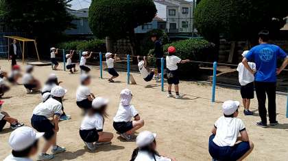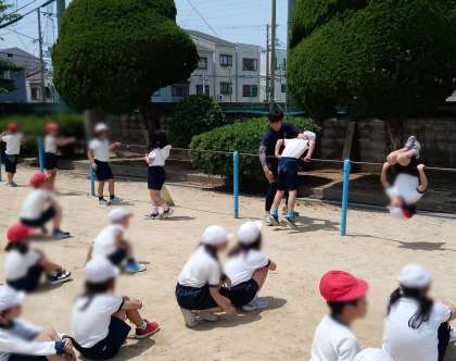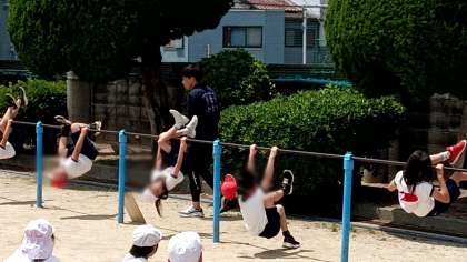 子どもたちは、鉄棒の握り方から基本的な上がり技、回り技、下り技などをユーモアな替え歌のリズムに合わせて楽しく練習していました。