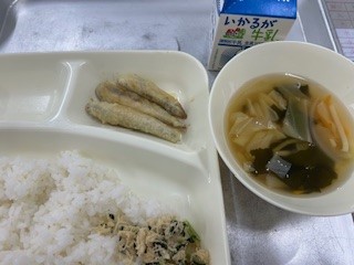 今日の献立は ・いわしてんぷら ・五目汁 ・とりなっ葉いため ・ごはん ・牛乳 です。