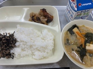 今日の献立は ・鶏肉の甘辛焼き ・みそ汁 ・魚ひじきそぼろ ・ごはん ・牛乳 です。