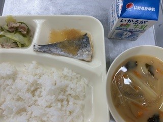今日の献立は ・さごしのおろしじょうゆかけ ・みそ汁 ・野菜いため ・ごはん ・牛乳 です。
