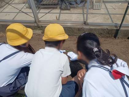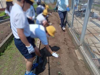 5年生の理科は、プール近くの学習園にヘチマの苗を植えていました。これは、秋ごろに学習予定の「花から実へ」でヘチマを使って植物の結実について調べるためのものです。