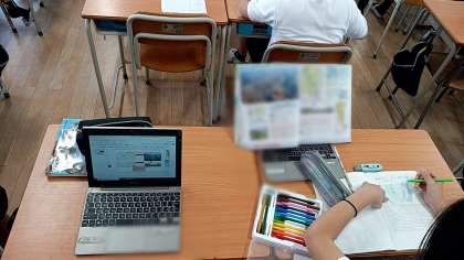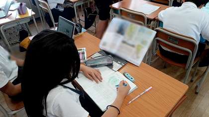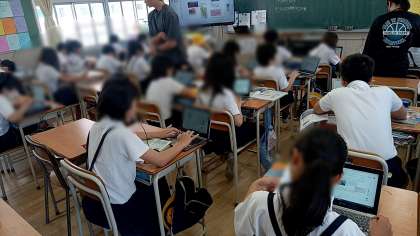 子どもたちは、川に囲まれた土地のようすを教科書から読み取り、要点をタブレット、もしくはノートのどちらかを選択してまとめていました。
