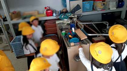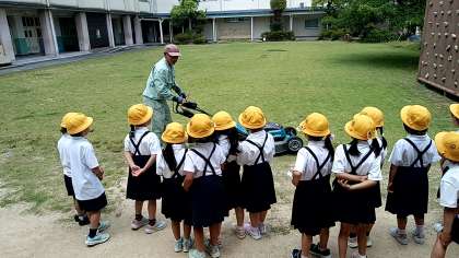 目的は2つ。1つ目は、管理作業員さんが芝刈り機を使って中庭の手入れをしているようすを見学しました。2つ目は、私たち教職員でも普段目にすることが少ない「作業部屋」の中に入らせていただきました。特に作業部屋は、物を作るときに必要な工具等がいろいろとそろっていて、子どもたちはそれを珍しそうに見ていました。