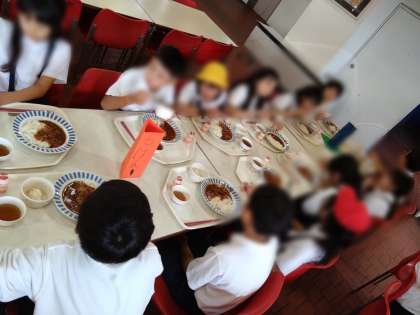 午前の活動が終わり、昼食のようすです。メインはハッシュドビーフです。