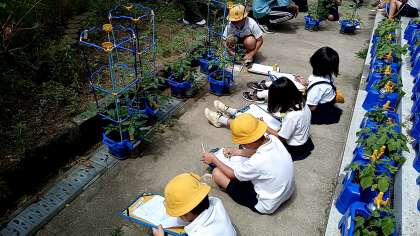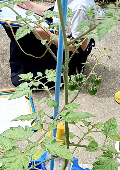 ミニトマトには緑色の実がつき始めていました。夏休み前にはふっくらとした赤い実がたくさんできることでしょう。楽しみですね。