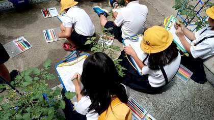 2年生の生活で育てているミニトマトが順調に育っています。子どもたちはその生長のようすをワークシートに絵と文で表現していました。