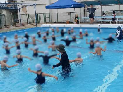 そんな中、2年生と1年生のプール開きが行われました。写真は1年生のようすです。1年生はもちろん小学校生活初めてのプール水泳で、学校の大きなプールで泳ぐのが初めてとなります。初めて入水したときの「ワー!キャー!」という子どもたちの叫びが楽しさを表していました。