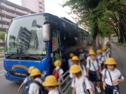 今、バスで学校を出発し、万博会場へ向かいます。