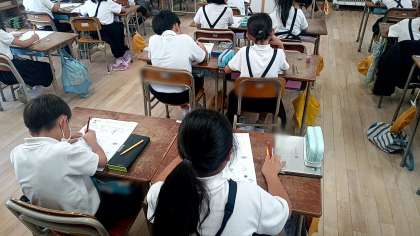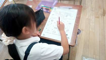 子どもたちは自分たちが普段からよく口にしている食べ物をワークシートを使って赤、黄、緑の三色に分類していました。