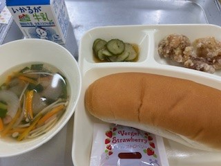 7/1 今日の給食 公開日 2025/07/01 更新日 2025/07/01 お知らせ 今日の献立は ・鶏肉のからあげ ・ハムととうがんの中華スープ ・きゅうりのピリ辛あえ ・いちごジャム ・コッペパン ・牛乳 です。 いいね(0)