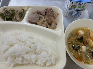 今日の献立は ・豚肉のしょうが焼き ・ツナと野菜のいためもの ・五目汁 ・ごはん ・牛乳 です。