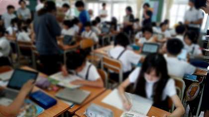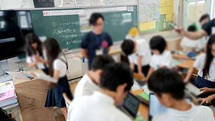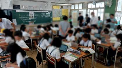 本時の課題は、米の年間耕作時間は減っているのに生産量は増えている理由について考えました。子どもたちは、教科書やタブレット上にあるデータや資料の中から必要な情報を選んで、自分なりに学習ノートやタブレットのスライドを使ってまとめていました。