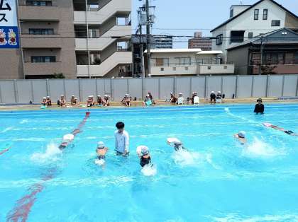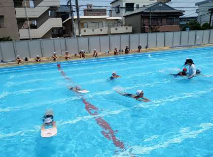 7/4 3年 体育科 公開日 2025/07/04 更新日 2025/07/04 お知らせ 今日も午前中からうだるような暑さの中、3年生はプール水泳学習をしました。 写真のようにビート板を使ってバタ足の練習をしていましたが、以前と比べるとみんな上手にできていました。 バタ足は泳ぎの基本で、きれいにしっかりとできるようになると、全身を使ってスムーズに泳げるようになります。 今度はビート板なしできれいにバタ足ができるようになればいいですね。 いいね(0)