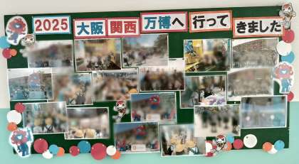 上の写真は、校長室前にある掲示板です。関西万博の遠足の様子がご覧になれます。以前は前半組(1、4、5年)の掲示でしたか、7月からは後半組(2、3、6年)のようすが飾られています。